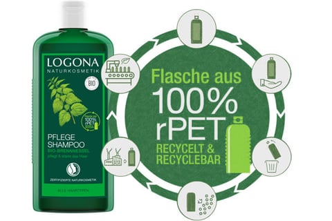 このリサイクルされたボトルにCO2ニュートラルなロゴナ製造工場でオーガニック処方の製品が充填されています。
